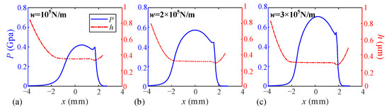 Distribution diagram of oil pressure (P) and film thickness (h) under unit line loads. (a) Unit line load w = 105 N/m, (b) Unit line load w = 2 × 105 N/m, (c) Unit line load w = 3 × 105 N/m.