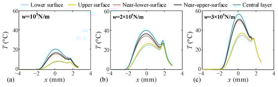 Temperature rise distribution of each layer of the oil film under different unit line loads. (a) Unit line load w = 105 N/m, (b) Unit line load w = 2 × 105 N/m, (c) Unit line load w = 3 × 105 N/m.