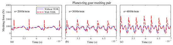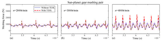 In this section, the dynamic characteristics of the dual-star gear system under different input speeds are investigated. Since both the planet-planet and sun-planet meshing pairs in this system exhibit similar external gear meshing characteristics, only the sun-planet and planet-ring meshing pairs are selected for analysis in this paper. The dynamic meshing forces for each meshing pair with and without TEHL are shown in Figure 13 and Figure 14, with an input torque T of 100 N·m and rotational speeds n of 2000, 3000, and 4000 r/min, respectively.