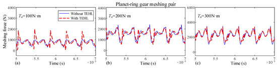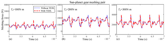 In this section, the dynamic characteristics of the dual-star gear system under different input torque conditions are investigated. The dynamic meshing forces for each meshing pair with and without TEHL are shown in Figure 15 and Figure 16, with a rotational speed n of 3000 r/min and input torques T of 100 N·m, 200 N·m, and 300 N·m, respectively.
