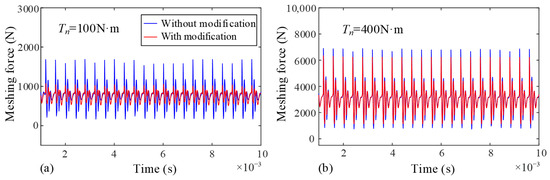 Dynamic meshing force comparison. (a) Input torque Tn = 100 N, (b) Input torque Tn = 400 N.