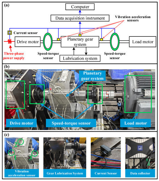 Schematic diagram and test bench for planetary gear system. (a) Schematic diagram of the test bench, (b) Physical test bench, (c) Key components of the test bench. Label “1”, “2”, and “3” represent the installation positions of three vibration acceleration sensors in the experiment.