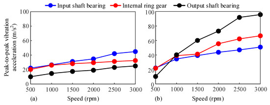 Peak-to-peak vibration acceleration of each measuring point at different input speeds. (a) Dry friction, (b) With lubrication.