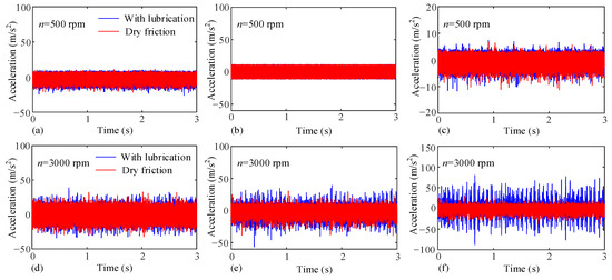 The speeds are 500 rpm and 3000 rpm, respectively. The measurement results of each vibration sensor are presented in Figure 20. It can be seen that under the same torque, compared with the working condition of 500 rpm, the vibration acceleration results of lubrication and dry friction at 3000 rpm show a greater difference. The vibration acceleration fluctuation under lubrication conditions becomes larger and produces obvious peaks. This is related to the meshing impact caused by the oil film on one hand, and on the other hand, it is because the thickness of the oil film increases with speed. At high speeds, the oil film thickens, which greatly advances the position of the gear teeth at the meshing point, resulting in an increase in meshing impact. The meshing impact vibration is transmitted to the measurement points of each vibration sensor, causing the vibration acceleration to increase. The conclusion of this part is also consistent with that in Section 4.2.1.