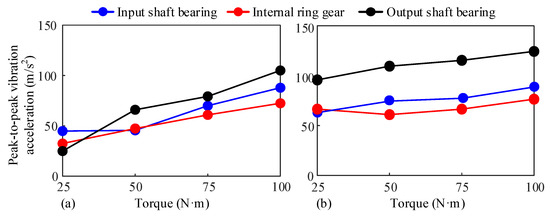 Peak-to-peak value of vibration acceleration of each measuring point under different input torques. (a) Dry friction, (b) With lubrication.