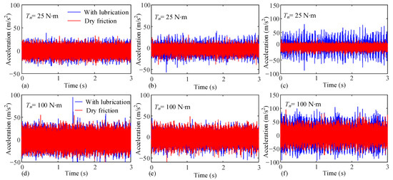The torques are 25 N·m and 100 N·m, respectively. The measurement results of each vibration sensor are presented in Figure 22. It can be observed that at the same rotational speed and torque, the vibration acceleration fluctuation under lubrication conditions is greater. Compared with the working condition of 100 N·m, the vibration acceleration results of lubrication and dry friction under the working condition of 25 N·m show more significant differences and produce more obvious peaks. This phenomenon occurs because when oil is sprayed onto the tooth surfaces, an oil film forms between the contacting surfaces. When the interfaces of the two teeth do not come into contact but the relative distance is less than the maximum central film thickness, the tooth pairs already exert force and undergo meshing deformation under the action of lubricating oil, causing the gear tooth pairs to enter the meshing state prematurely. The premature meshing of gear pairs increases the meshing deformation, thereby intensifying the meshing-in impact. Furthermore, as the film thickness increases with decreasing torque, the oil film becomes thicker at lower torque levels. This causes the position of the gear teeth at the meshing point to advance significantly, resulting in increased meshing impact. The meshing impact vibration is then transmitted to the measurement points of each vibration sensor, leading to increased vibration acceleration.