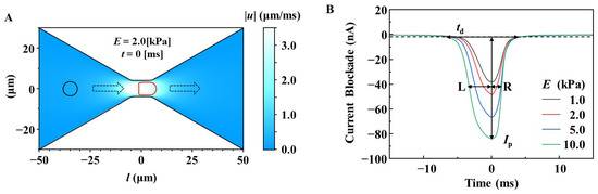 (A) Simulation model of an RBC passing through a micropore with a diameter of 8.0 μm and a length of 10.0 μm. The RBC is assumed as a spherical membrane with a diameter of 7.5 μm. (B) Simulated waveforms for the translocation of the RBC models with different Young’s moduli. Note that as the Young’s modulus increases, pulse height (Ip), duration time (td), and asymmetry (L/R ratio) increase.