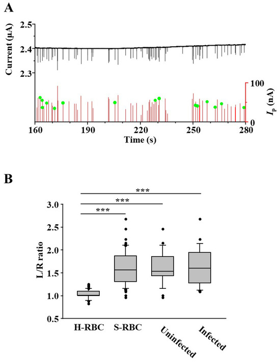 (A) Scattering plot of transit time versus ionic current dip for S-RBC. The waveform signals of detected RBCs are marked with red lines. The signals of RBCs with schizonts inside detected by fluorescence microscopy are marked with green circles. (B) L/R ratio of the waveforms for uninfected RBCs (uninfected) and RBCs with schizonts (infected) in the S-RBC group were compared and analyzed. *** p < 0.001.