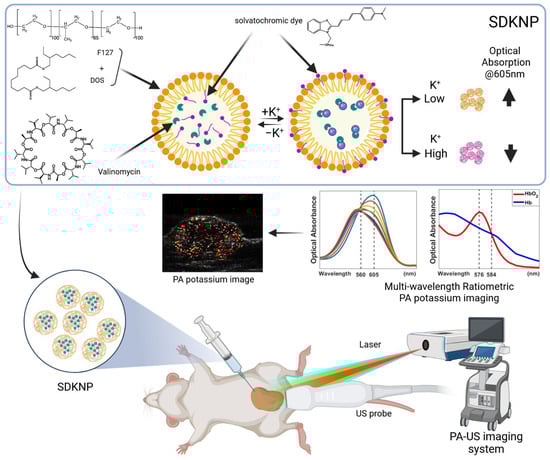 Illustration of photoacoustic K+ imaging with solvatochromic dye-based K+-sensing nanoparticles (SDKNP). The SDKNP potassium probe has a characteristic absorption change depending on the K+ levels. The K+ image was obtained using a multi-wavelength ratiometric photoacoustic imaging method.