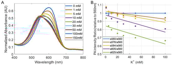 Optical properties of SDKNP. (A) Spectroscopic optical absorption of SDKNP at different K+ levels. (B) Absorption ratios between each wavelength relative to 560 nm, which is the isosbestic point of the absorption changes.