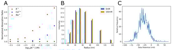 Calibration and characterization of SDKNP. (A) A ratiometric calibration of SDKNPs’ optical absorption changes against various ions. Ratios of the absorption peaks at 520 nm over 600 nm were plotted against ion concentrations. All measurements were taken at a constant ionic strength using LiCl to maintain constant tonicity. (B) Dynamic light scattering measurements of SDKNP size at both 0 and 100 mM K+, again using LiCl to maintain constant tonicity. (C) Measurement and distribution of zeta potential for the SDKNPs.