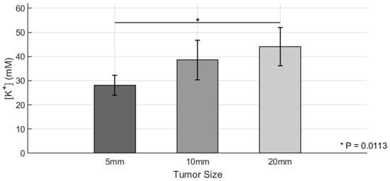 To investigate the relationship between tumor size and extracellular K+ levels, we employed PACI using a K+-sensitive nanoprobe, SDKNP. The probe was developed in the Bakker group [23], and its characterization is summarized in Figure 3. Due to the employment of the potassium ionophore valinomycin, the probe displays excellent selectivity over the sodium ion, and minimal interference from calcium at physiological concentrations (Figure 3A). The radius of the nanosensors is approximately 50 nm on average, and no significant change in size is observed between high- and low-potassium environments (Figure 3B). An average zeta potential of −30 mV indicates that the probe is stable and unlikely to flocculate (Figure 3C).