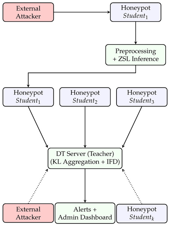 This inverse distillation strategy allows the DT to learn from the distributed knowledge of honeypots without requiring access to raw traffic data. The data flow in the proposed security framework (see Figure 2) captures the interaction between attackers, honeypots, and the DT server using ZSL and IFD.