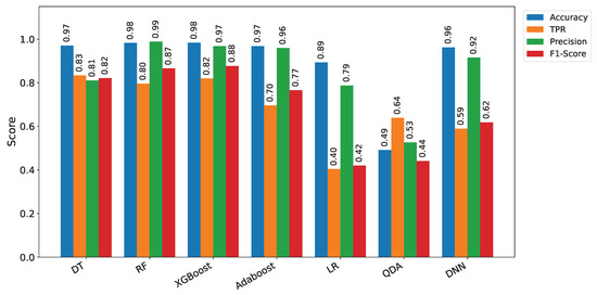 TwinFedPot performs zero-shot inference on 64 network flow sentences in under 0.019 s using the all-MiniLM-L6-v2 model on a standard Colab CPU (Intel Xeon), eliminating the need for local training, and enabling efficient real-time detection. In parallel, Lightweight KL-based aggregation at the server further reduces computation and communication overhead, aligning with recent findings in efficient federated distillation [34] and zero-shot cost prediction [35]. We first evaluated traditional ML and DL models on the CIC IoT 2023 dataset, as illustrated in Figure 4 and detailed in Table 2. Classical models such as Random Forest and XGBoost achieved a notable high classification accuracy on the client side, up to 98%. However, despite these promising results, these models exhibit critical limitations. In particular, their true positive rates (TPRs) remain suboptimal (≤0.82), indicating a reduced ability to correctly detect actual attacks. In addition, these methods are prone to overfitting and impose significant computational overhead, making them less suitable for deployment in resource-constrained IoT environments.