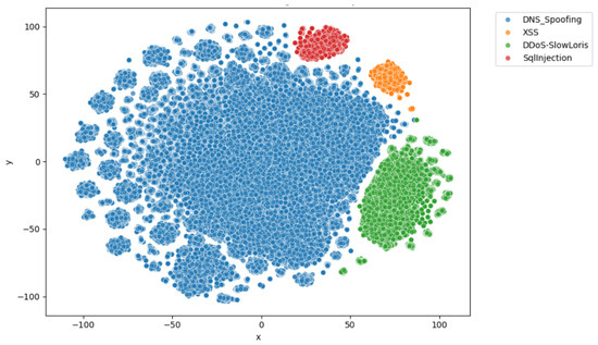 Figure 6 presents a t-SNE projection of zero-shot text embeddings generated using the all-MiniLM-L6-v2 model, with points colored according to ground truth labels (DNS Spoofing, XSS, DDoS-SlowLoris, SqlInjection). The formation of distinct clusters demonstrates that the embeddings capture class-wise separability effectively, underscoring their suitability for supporting security analysis and classification tasks within our framework.