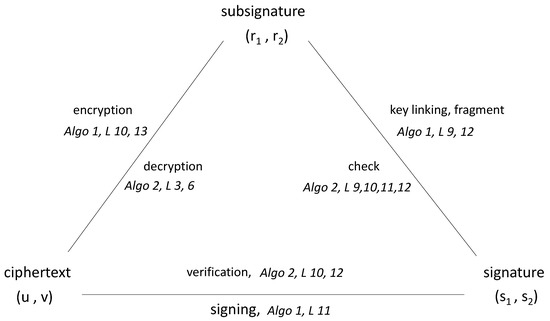 where h is the plain text’s hash, are sender secret keys, and is the signature. From (4), serve as the subsignature due to implicating the message hash and sender secret keys.