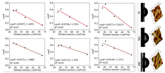 Contact angle–surface tension relationships and microstructural features on the adaxial and abaxial surfaces of mango leaves: This figure illustrates the fitted contact angle curves and corresponding microstructural characteristics of both adaxial and abaxial leaf surfaces at different growth stages, subjected to four types of test solutions. The results indicate an overall increasing trend in contact angle with leaf maturation, accompanied by a well-defined variation in critical surface tension. The Zisman fitting curves reveal the responsiveness of droplet spreading behavior to changes in surface energy. Contact angle measurements and atomic force microscopy (AFM) images reveal the evolution of surface roughness and microstructure, highlighting how these structural changes collectively influence the wetting behavior of mango leaves.