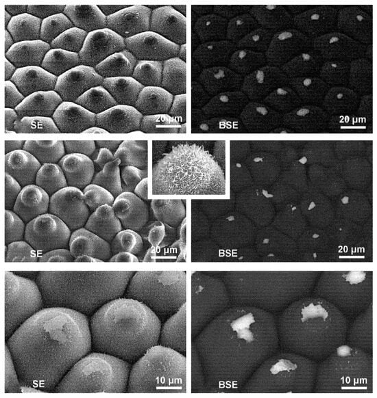 - Ensikat, H.J.; Mayser, M.; Barthlott, W. Superhydrophobic and adhesive properties of surfaces: Testing the quality by an elaborated scanning electron microscopy method. Langmuir 2012, 28, 14338–14346. [Google Scholar] [CrossRef]