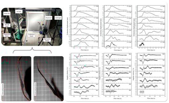 Measurement system and analysis results of peach leaf motion characteristics based on high-speed photography and image tracking: The top-left panel illustrates the experimental setup, which includes a vortex fan, high-speed camera, LED lighting, calibration board, and leaf clamping device. The bottom-left panel shows the schematic diagram of leaf posture changes during the torsional motion. The right panels present the time-series variations of lateral displacement, vertical displacement, and angular velocity of the leaf tip under different wind speeds (2–8 m/s) and platform translation speeds (0.5, 0.75, and 1.0 m/s). The results indicate that both wind speed and platform movement significantly affect the leaf’s oscillation amplitude, torsional duration, and dynamic response characteristics.
