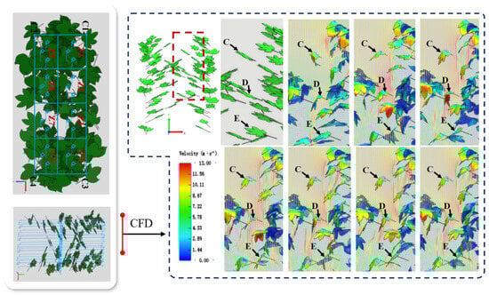 Dynamic response of canopy leaves and flow field coupling under wind loading: The figure illustrates the coupled airflow–leaf interaction simulated using a CFD-based model. The canopy environment was simulated using the Reynolds-averaged Navier–Stokes (RANS) equations with the standard k–ε turbulence model, assuming incompressible and steady-state flow. The leaf surfaces were modeled as rigid and non-deformable. Boundary conditions included a uniform inlet velocity of 12 m/s, a pressure outlet, and no-slip wall conditions. Simulation results show that exposed leaves experience strong aerodynamic responses, with distinct vortex formation observed on the leeward side. In contrast, leaf clusters exhibit relatively weaker motion. Under continuous airflow, leaf vibration gradually stabilizes, and low-velocity channels emerge within the canopy, potentially enhancing droplet penetration. The color map represents airflow velocity, with red indicating high-speed regions and blue representing low-speed zones. Leaves labeled C, D, and E represent three typical leaves at different positions in the canopy used to analyze their deformation and interaction with the airflow over time.