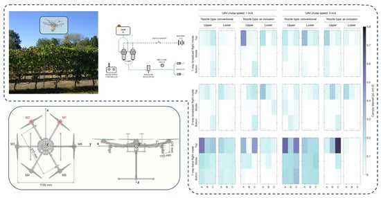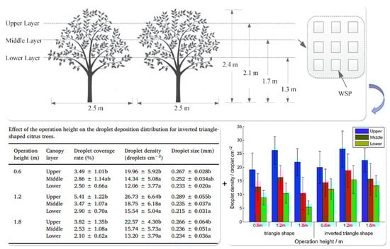 Studies have shown that differentiated droplet size strategies should be applied to match specific target zones within the canopy, balancing deposition efficiency and penetration performance. This enables stratified and directional application suitable for diverse orchard spraying scenarios [87]. As shown in Figure 9, field measurements under UAV-based spraying conditions reveal a strong correspondence between droplet size distribution and deposition responses across different canopy layers at varying flight altitudes. These findings highlight the potential of UAV systems in regulating both penetration and deposition uniformity. Compared with traditional ground-based sprayers, UAVs offer superior altitude flexibility and adaptability to target zones, presenting a promising engineering pathway for achieving stratified and site-specific spraying.