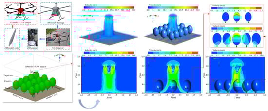 CFD–FSI-based simulation of airflow–structure coupling within the canopy: This figure shows airflow distribution and leaf deformation within a canopy under wind speeds of 0, 5, 10, and 15 m/s using a CFD–FSI approach. The canopy model was reconstructed from three-dimensional leaf point clouds, with simplified petiole structures. Boundary conditions included a top constant-velocity inlet, a zero-pressure outlet, and no-slip walls elsewhere. Airflow was solved using the RNG k–ε model, and leaf flexibility was considered. The left panel presents the modeling workflow, including three-dimensional reconstruction and porosity extraction steps; the right panel displays airflow fields, deformation patterns, and porosity profiles at different heights. Results indicate that increasing wind speed significantly alters flow penetration and canopy porosity, underscoring the role of aerodynamic–structural coupling in spray dynamics. Reproduced from Cui et al. [81] under the terms of the Creative Commons Attribution License (CC BY 4.0), © Cui, Wang, Lu, Liu, and Yuan (2023), published in Frontiers in Plant Science.