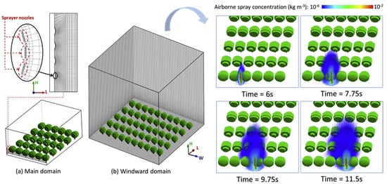 Turbulence further increases the uncertainty of droplet transport pathways. Moderate turbulence is beneficial for disrupting laminar flow structures [75], thereby enhancing droplet mixing and penetration capabilities. However, excessive turbulence intensity may destabilize droplet trajectories, leading to dispersed deposition and reduced targeting accuracy. Turbulence characteristics are typically quantified using turbulent kinetic energy (TKE) and turbulence intensity indices. The response of droplets to turbulent fluctuations is closely related to their size and inertial scale. In simulation studies, computational fluid dynamics (CFD) has been widely employed to analyze droplet trajectories and deposition patterns under varying wind speeds and turbulence conditions. As shown in Figure 7, some studies have adopted numerical modeling approaches with different turbulence models to accurately reproduce the dynamic interaction processes between airflow and spray clouds [76].