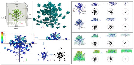 Recent studies have widely adopted fluid–structure interaction (FSI) models based on computational fluid dynamics (CFD) to enable bidirectional simulation of wind–leaf interactions [81], as illustrated in Figure 8. By capturing the feedback effect of leaf deformation on airflow trajectories, a more realistic and dynamically responsive canopy model can be constructed. The simulation examined the variation in canopy porosity under wind speeds ranging from 0 to 15 m/s. Results indicated that at a wind speed of 15 m/s, the porosity in the mid-canopy layer increased by 36.28% compared to that at 5 m/s. This increase was primarily attributed to pronounced leaf bending and structural reconfiguration, which reduced localized aerodynamic resistance and reshaped internal airflow channels.