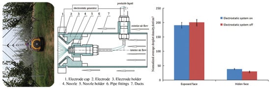 Electrostatic spraying enhances droplet adhesion through electrical charging, increasing deposition efficiency under the influence of electrostatic fields around leaves [90,91,92]. This approach is particularly effective for reaching concealed areas such as the undersides of leaves. Charged droplets exhibit a “reverse adhesion” phenomenon under positive–negative polarity induction, with studies reporting up to a 30% increase in deposition efficiency [93,94], as illustrated in Figure 10. However, the effectiveness of electrostatic spraying is influenced by multiple interacting variables: higher voltages increase charge density but pose risks of corona discharge; smaller droplets acquire charge more readily but are more prone to environmental interference. Thus, the system must be holistically optimized across voltage level, droplet size, velocity, and ambient humidity.