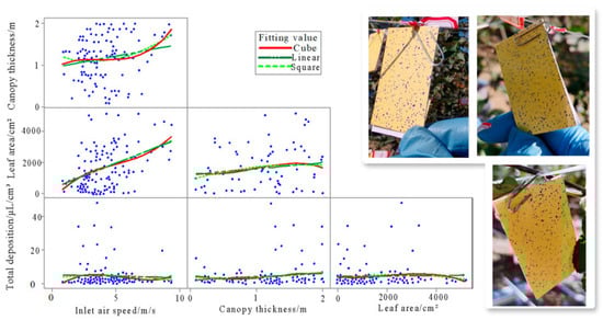 Visual analysis of the effects of leaf area and canopy structure on droplet deposition distribution: The left panel illustrates the effects of wind speed, canopy thickness, and leaf area on droplet deposition, while the right panel presents the corresponding water-sensitive paper sampling results. Fitting model analysis reveals that with increasing canopy thickness and leaf area, droplet deposition exhibits non-linear fluctuations, characterized by a distinct gradient pattern—higher deposition in the outer layers and reduced deposition in the inner canopy, particularly in high leaf area regions. Among the tested models, the quadratic fit yielded the best performance, with coefficients of determination (R2) of 0.018 for wind speed, 0.014 for canopy thickness, and 0.016 for leaf area, indicating moderate explanatory power for these structural variables in influencing spray distribution.