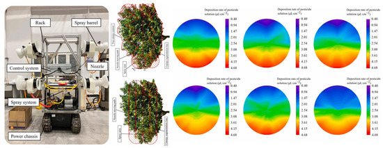 With the transformation of agricultural production towards greater precision, informatization, and sustainability, orchard pest and disease control are increasingly shifting from traditional, extensive spraying practices to more targeted, site-specific, and eco-friendly approaches [1,2,3,4]. As one of the most widely employed and impactful technologies in orchard protection, spraying systems play a critical role in determining pesticide utilization efficiency and fruit safety [5]. However, conventional spraying methods typically rely on empirically set parameters, often neglecting essential variables such as crop spatial architecture [6,7] and dynamic wind field conditions. This results in substantial pesticide drift [8], poor deposition efficiency, and heightened environmental contamination. In this study, the term “wind” specifically refers to the artificially generated airflow produced by air-assisted spraying systems. This controlled airstream forms a defined wind field within the spraying apparatus, which is designed to optimize droplet trajectory, enhance canopy penetration, and improve deposition efficiency within the canopy structure. In contrast to ambient wind—an uncontrolled environmental factor—the airflow generated by the sprayer constitutes a regulated aerodynamic field that directly influences droplet drift and deposition dynamics.