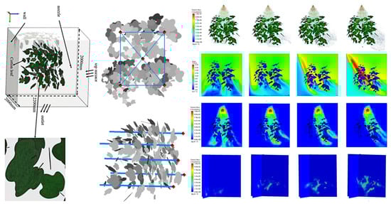 From a modeling perspective, previous studies have employed lumped parameter models or flexible continuum models coupled with computational fluid dynamics (CFD) platforms to simulate the dynamic responses of local leaf clusters under wind field conditions [56], as illustrated in Figure 4. Some works have further integrated discrete element methods (DEMs) and multibody flexible dynamics approaches to model the coordinated motion of multiple leaves subjected to complex airflow interactions. The simulated leaf dynamics and local flow field structures revealed through these models offer valuable insights for identifying spray windows and controlling nozzle activation timing. Such information supports the development of variable-rate spraying strategies, particularly for optimizing targeted pesticide application in multilayered canopy environments.