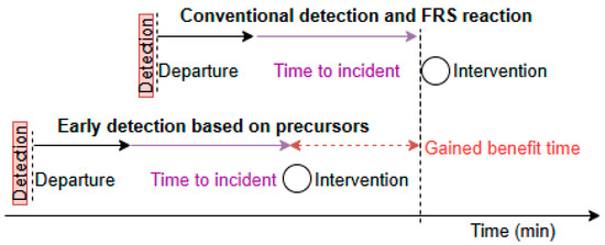 When a fire is detected, firefighters face unavoidable delays in physically reaching the scene. The average time to arrival at the scene of an incident is 7.5 min in Czechia [1]. The arrival time depends on many factors, let us assume we cannot influence it (i.e., weather, traffic, route). Although 70% of nearest FRS (“fire rescue service”) units are located within 5 km of the site of emergency. The Figure 1 illustrates the timeline between the early detection proposed in this study and the arrival of fire rescue services.