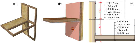 The test specimen (Figure 4) was constructed with two sets of vertically arranged cavities, visible from the front elevation (Figure 4a). The cavities on the left were filled with mineral wool insulation (MV) to match the depth of the timber structural members (KVH–timber prism), while the cavities on the right were intentionally left uninsulated.