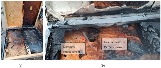 The main sensors relevant to this research—the smoke and gas sensors—were placed on the lower floor, under the upper beam (Figure 4a and Figure 5b). We chose this location because smoke and hot gases would rise in this direction and at the same time we could not expose the sensors to direct fire, which would occur first in the central area.