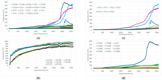 (a) All temperature trends from thermocouples on the test specimen. (b) Burner temperatures. (c) Temperatures in the specimen in the hollow section showing progressive burn-through. (d) Temperatures in the specimen in the insulated section. Note: Due to the quantity of presented curves, the colors/curves in (a–d) do not correspond. Figure 6 provides a clear view of the temperature range within which the experiment was conducted. The observed events correlate with the sharp change in temperatures.