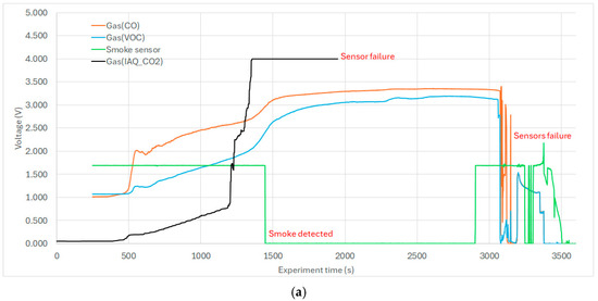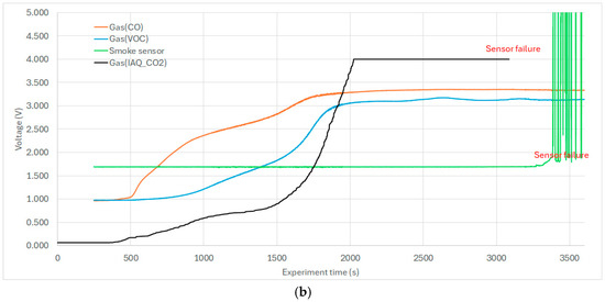 To interpret the gas and smoke sensor data (Figure 7), it was essential to correlate their outputs with temperature trends (Figure 6). In the hollow section below the ceiling joint, the sensors recorded an early rise in volatile organic compounds (VOCs) and carbon monoxide (CO), indicating material heating. This was followed by an increase in carbon dioxide (CO2), a byproduct of combustion (Figure 7a). At approximately T = 17 min, structural burn-through occurred, allowing combustion gases to enter the cavity. By T = 21 min, the commercial smoke detector was activated; however, the VOC and CO sensors had already reached output voltage saturation. The early rise in VOC and CO at T = 6 min suggests a 15 min advantage for early fire detection compared to the smoke detector.