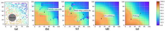Gaussian single-kernel interpolation (Figure 1d): Gaussian single-kernel interpolation, typically based on Gaussian process regression (GPR) with a fixed kernel, provides smooth and continuous estimation while modeling spatial correlations. In this work, a modified inverse square (InvSq) kernel derived from the inverse-square law [] is employed to achieve a globally smooth fit of the radiation field, consistent with the attenuation pattern in free space without obstacles. However, it performs poorly in regions affected by obstacles, failing to reflect local discontinuities and gradient transitions. This results in overfitting in smooth areas and significantly elevated prediction variance near obstacle boundaries.