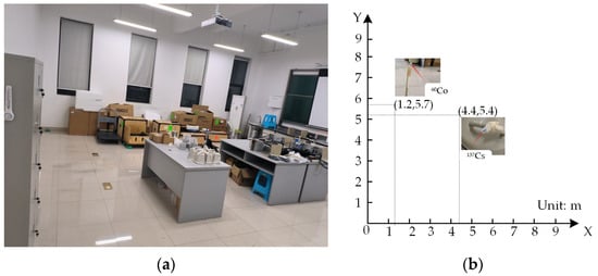 Experimental environment and radiation source placement. (a) Layout of the laboratory environment with obstacles. (b) Configuration of radiation source positions within the experimental domain.