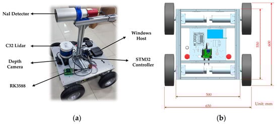 Radiation detection robot system architecture. (a) Physical view of the developed mobile robot equipped with NaI(Tl) detector, C32 LiDAR, depth camera, and RK3588 processor. (b) Mechanical layout of the robot chassis.