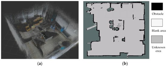 Environmental raster data acquisition: In parallel with point cloud reconstruction, 2D environmental mapping was conducted by using the Cartographer algorithm on a Linux system. With optimized parameters (submap size 8 m × 8 m, loop closure detection threshold 0.15), a 2D occupancy grid map of the environment was generated, providing a complementary spatial representation for radiation distribution reconstruction. The result map is shown in Figure 4b.