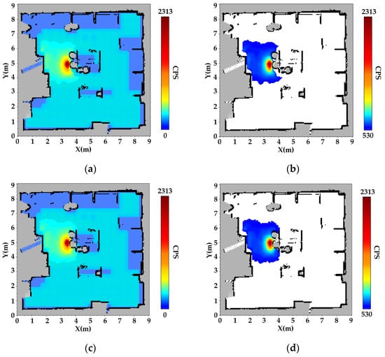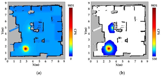 Following data acquisition, the radiation counts distribution map was constructed using a multi-kernel weighted interpolation method. Spatiotemporal data registration across multiple sensor modalities was implemented within the ROS framework, enabling precise alignment of radiation counts with SLAM-derived coordinates via timestamp synchronization. The radiation counts presented in Figure 5 and Figure 6 represent the total gamma-ray count rates (cps) measured by the NaI(Tl) detector. These counts reflect the combined contributions of the 137Cs and 60Co sources in the dual-source scenario, as well as background and scattered radiation. The interpolated radiation mapping for single-source scenario 137Cs is presented in Figure 5, based on the generated occupancy grid map and the fused spatial data.