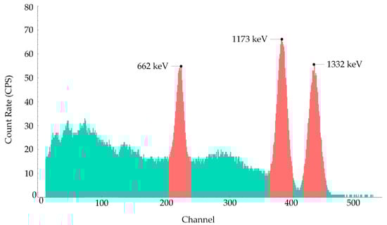 Gamma-ray energy spectrum acquired by the NaI(Tl) detector in a mixed-source environment. The turquoiseregion represents background and scattered radiation; the red peaks correspond to characteristic photo peaks of 137Cs (662 keV) and 60Co (1173 and 1332 keV). The energy channels 223, 382, and 433 correspond to the energies 662, 1173, and 1332 keV, respectively, reflecting the calibration of the energy spectrum.