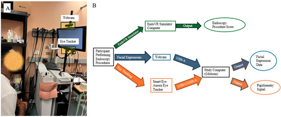 (A) Endoscopic simulator setup; (B) schematic diagram of data acquisition.