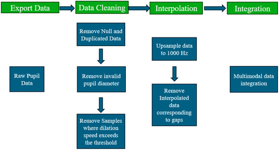 The sequence of steps includes data cleaning, interpolation of missing values, upsampling and integration with other modalities [11,13]. These steps are established best practices for eye-tracking research and are widely recommended in the literature to address common challenges such as noise, missing data, and synchronization issues, and to ensure data quality and reliability for subsequent analysis. By following this workflow, our approach supports robust integration of pupillometry data with other multimodal datasets, aligning with current standards in the field.