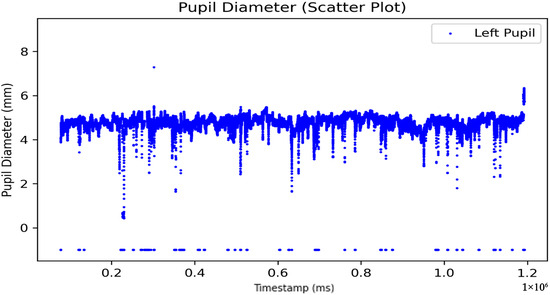 To ensure accurate preprocessing, only the timestamp and pupil diameter variables were retained. Rows without pupil diameter data were removed to address missing data issues. Additionally, duplicate timestamps that might have been caused by software errors were also removed. As measurements were taken for both eyes, each eye was processed independently to avoid the accidental removal of valid data when filtering out invalid values. For example, unprocessed data of the left eye pupil are shown in Figure 3. This systematic approach ensures the accuracy and reliability of the dataset.