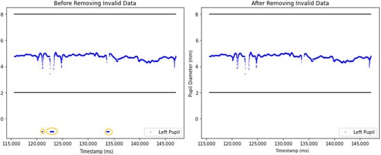 At the beginning of the preprocessing, null data and invalid pupil diameter samples were removed (Figure 4). Invalid pupil diameters were classified as diameter values falling outside the typical range of 2 mm to 8 mm, which often happened because of eye blinks, tracking system detection errors, or head movement [15].