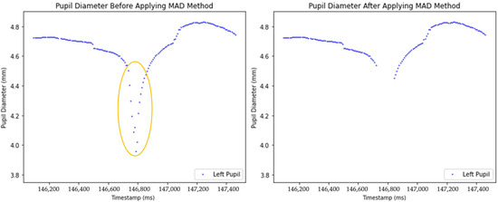 where represents a scaling factor that determines the sensitivity of the outlier detection process. In this study, was set to 18. Pupil diameters were classified as outliers and removed if their deviations exceeded this threshold [16].