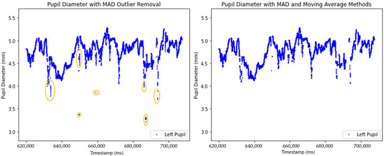The effects of two outlier removal methods on pupil diameter data are illustrated in Figure 6. The left plot presents the dataset after applying the Median Absolute Deviation (MAD) method to detect outliers, which effectively removes global outliers. The right plot demonstrates the combined approach of MAD and a Moving Average (MA) to detect outliers, smoothing local fluctuations, and removes global outliers.