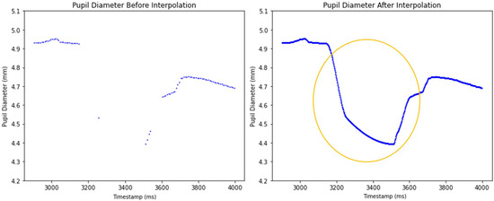 The effect of the PCHIP interpolation method is illustrated in Figure 7. The left graph displays the unprocessed pupil diameter data with gaps due to missing values, while the right graph presents the dataset after PCHIP interpolation has been applied. The interpolated dataset effectively fills these gaps and reconstructing a smooth and continuous pupil size signal at the higher 1000 Hz sampling rate.
